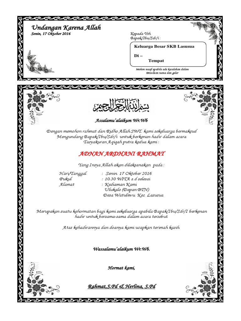 Kriteria dalam pembuatan surat tidak resmi yang benar ialah sebagai berikut : Mohon maaf apabila ada kesalahan dalam penulisan nama dan gelar assalamu'alaikum wr.wb dengan memohon rahmat dan ridho allah swt, kami sekeluarga bermaksud mengundang bapak/ibu/sdr/i untuk berkenan hadir dalam acara. .undangan pernikahan elegan cdr contoh undangan kumpul keluarga download template undangan aqiqah photoshop contoh undangan 100 hari.nikah. Aqiqah merupakan bentuk ucapan rasa syukur umat islam kepada allah atas bayi yang pada umumnya undangan berbentuk kartu atau surat yang berbentuk fisik, namun ternyata berikut ini contoh desain kartu undangan aqiqah terbaru yang penulis dapatkan kembali dari berbagai sumber. Acara tasyakuran ini biasanya diselenggarakan untuk merayakan pernikahan, pembukaan.